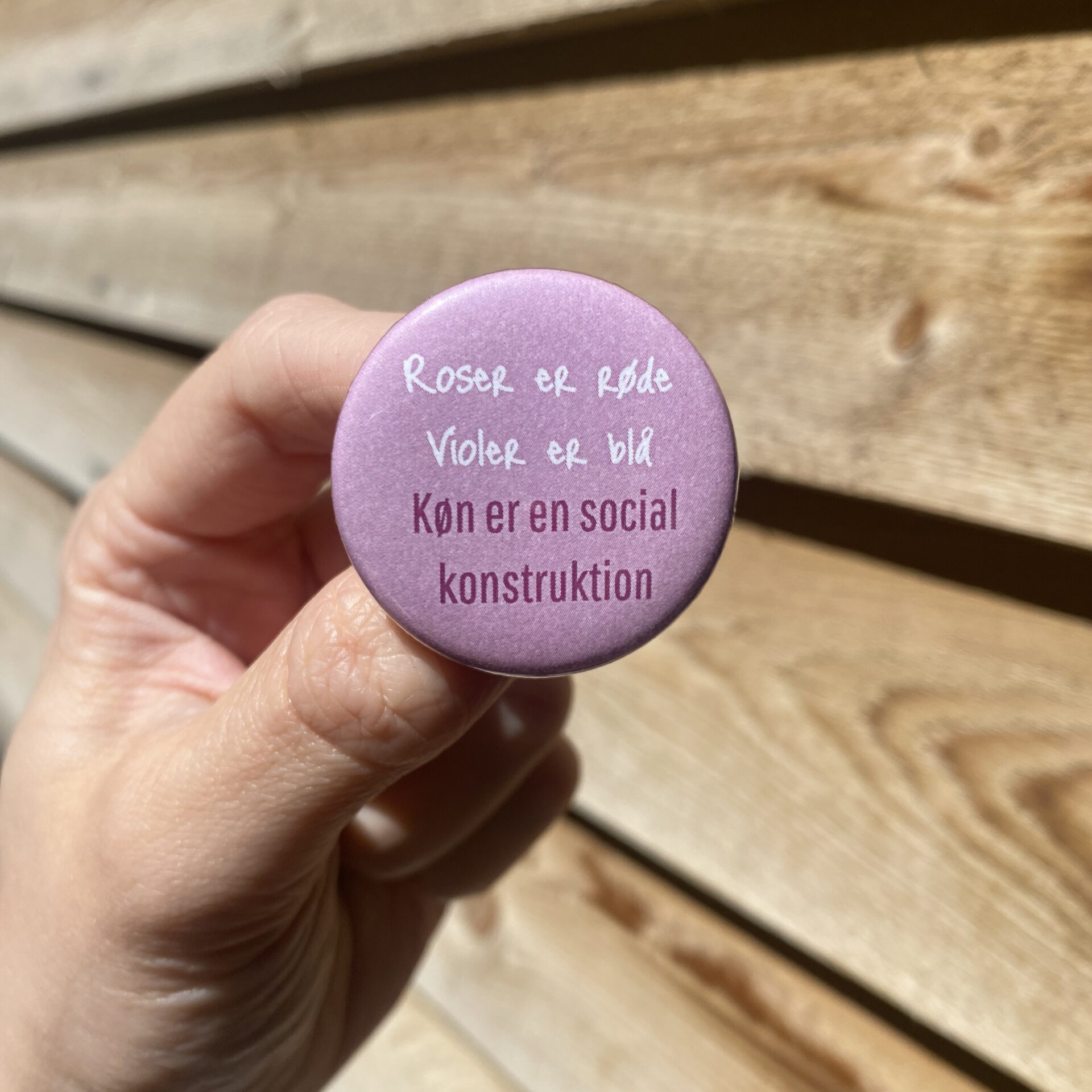 Badge på 2.5 cm med teksten “Roser er røde, violer er blå, køn er en social konstruktion.”